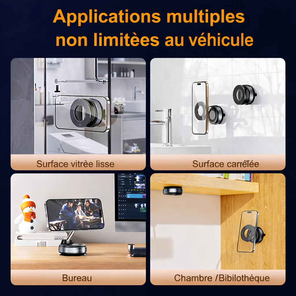 Ce support magnétique premium combine une adsorption sous vide ultra-stable et un système magnétique puissant offrant une tenue impeccable. Son bras articulé permet un ajustement précis pour une visibilité parfaite, sans gêner la conduite.